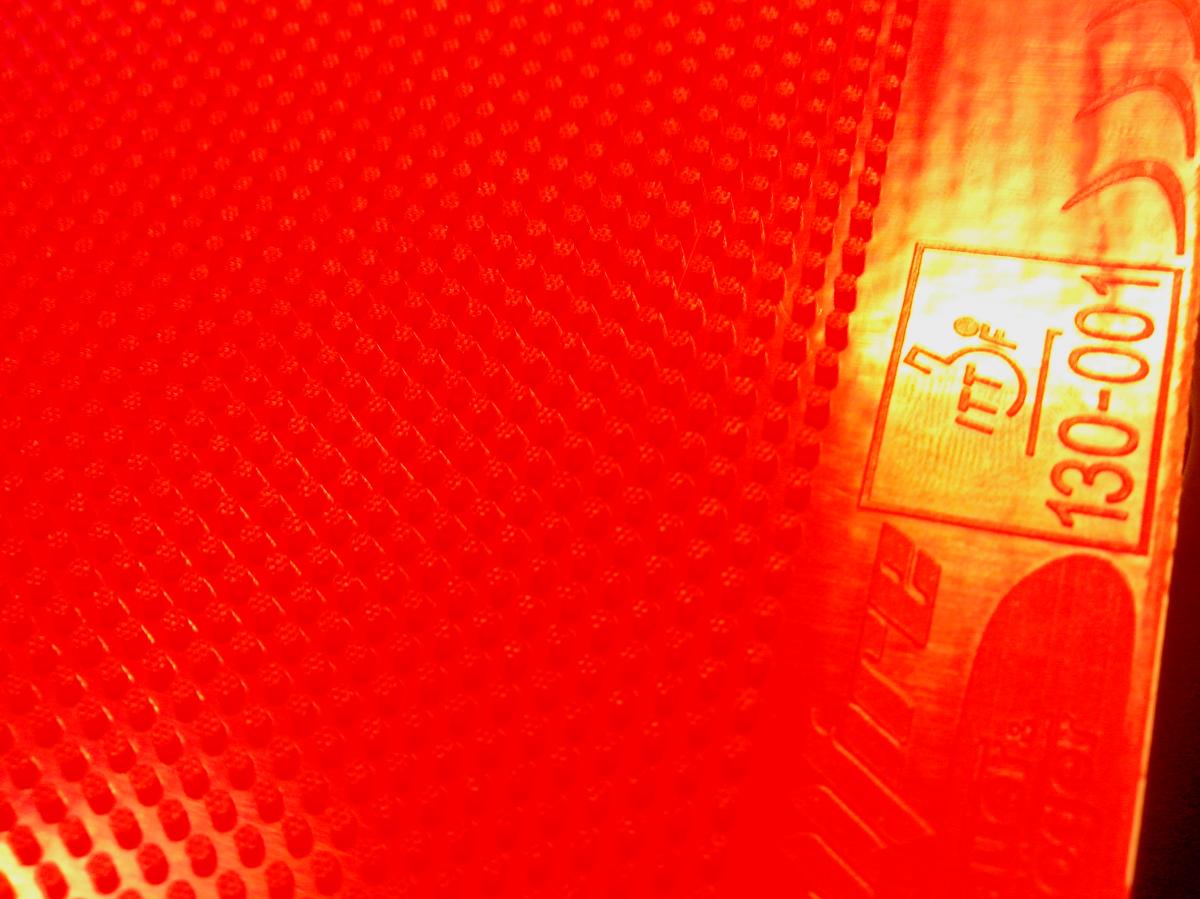 Die Noppen fühlen sich etwas härter als die meines Dtecs an, wobei mein Dtecs schon über 3 Jahre alt und dementsprechend weichgeklopft ist. Das Gummi an sich fühlt sich vor allem im Bereich des Schriftfeldes anders, als alle Noppen an, die ich bislang gespielt habe, irgendwie griffiger (nicht klebriger!). Die Noppenköpfe sind fein geriffelt und der Streichtest mit dem Ball ergibt eine hohe Griffigkeit.