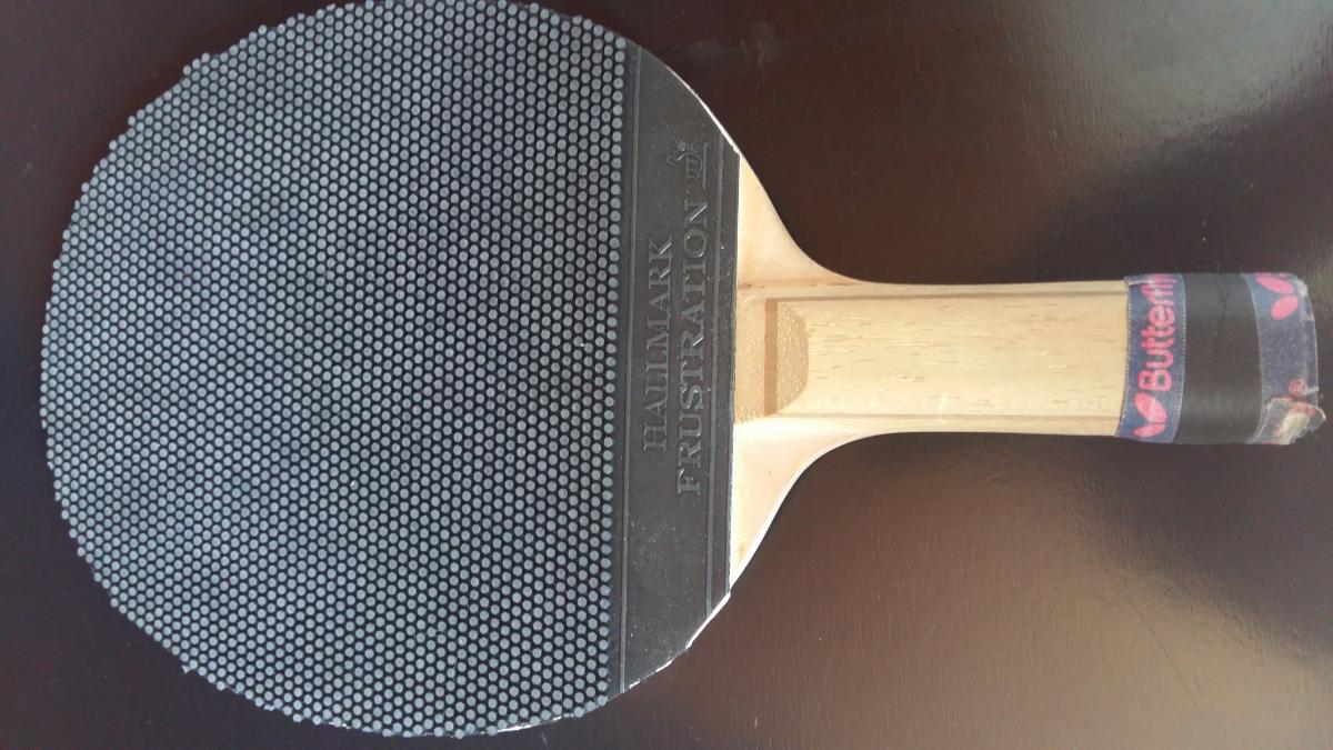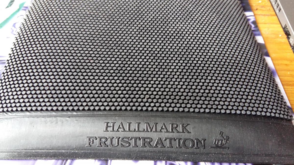 Nun bislang liegt also der Grass vorne. Heute habe ich allerdings den Hallmark Frustration in 2,0mm bekommen und habe ihn auf mein Kalinic geklebt, weil ich bei der offensiveren Spielweise zum ersten mal wirklich merke, dass ein vergrößertes Blatt, dafür nicht optimal ist. Der Belag sieht wirklich abgefahren aus. Die Noppen sind verblüffend breit. Nicht so karss wie der Curl P 2, aber doch ganz schön. Die Noppen haben eine deutlich rauhe Oberfläche und machen einen sehr elastischen Eindruck. Der Schwamm ist zwischen weich und mittelhart und macht auch einen elastischen ersten Eindruck. Ich bin sehr auf den Test gespannt. Ich hatte gerade ein paar schöne Erfolgserlebnisse mit dem H 3 Neo, aber das Factorytuning lässt schon nach. Statt meinem gewohnten T 25 in max. werde ich diesmal einen Vega Pro testen. Der gefiel mir schon immer gut, aber ich hab ihn immer nur bei Anderen getestet. Ich bin sehr gespannt und werde berichten.