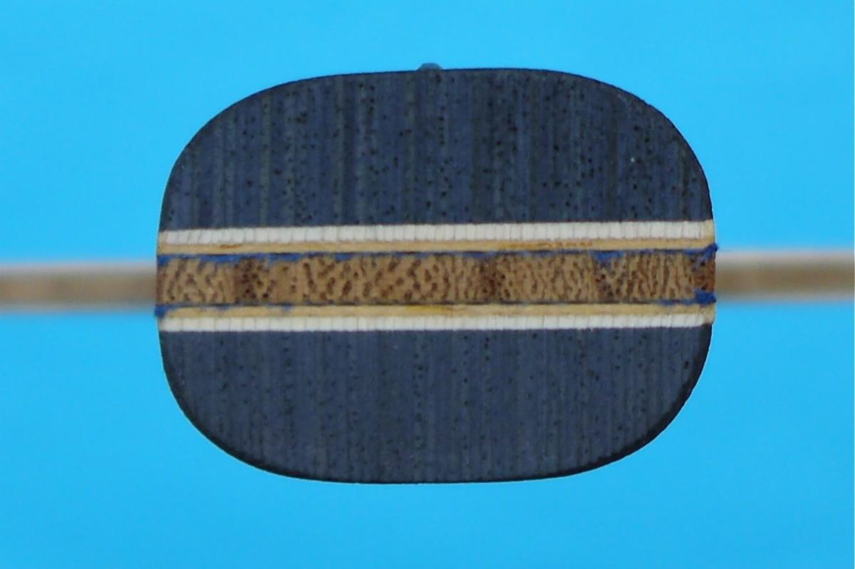 Die exakte Furnier-Zusammensetzung kenne ich leider nicht. Deckfurnier ist auf jeden Fall Kiso-Hinoki, der Kern ist aus Kiri und wurde "getrocknet" (wie das ja heute teilweise bei kompletten Hölzern gemacht wird). Die Kunstfaser (Arylate-Carbon) liegt direkt oberhalb des Kerns. Nur das Sperrfurnier ist mir nicht bekannt.