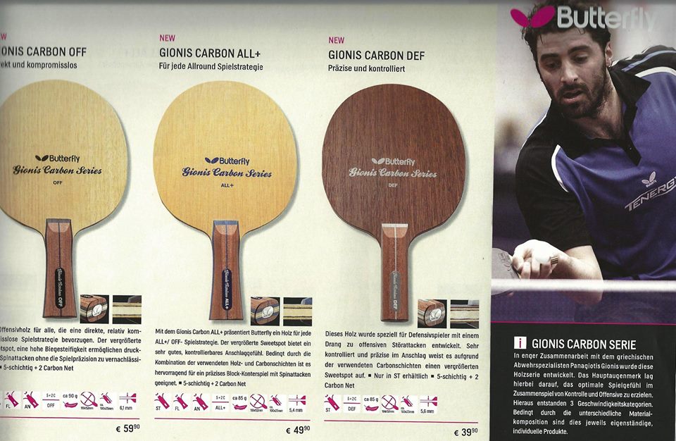 Habe mir diese Woche in Wien im dortigen Shop - übrigens ein sehr sympathischer Shopinhaber - auch ein Gionis Carbon ALL+ geholt und auch die übrigen beiden Varianten in Händen gehabt und gedotzt. Def hat mir eigentlich eine bessere Rückmeldung gegeben. Doch da ich ungern "Pfannen" spiele und mir die geraden Griffe "abgewöhnt" habe, entschied ich mich für ein ALL+ (87g) Traininieren konnte ich noch nicht und komme wohl diesen Monat auch nicht mehr dazu. Erste Dotztests mit P1R (1,0) Genius Optimum + / Ventus Speed / adidas P5 stimmen mich aber nicht so optimistisch. Mir fehlt da im Vergleich zu meinen Referenzhölzern (Ardency Carbon OFF- / Palio Yue Wang) etwas die Rückmeldung. Klingt mir irgendwie etwas zu sehr nach Kunststoff. Block kann ich mir gut vorstellen, weichere Bälle weniger. Meine Befürchtung ist, dass die Bälle - mit diesen Belägen - zu wenig Rotation erzeugen und zu gerade herausspringen. Lasse mich da gerne in der Praxis positiv überraschen, gehe aber mit gedämpften Erwartungen heran. Vom Feeling her doch kein Holz von dem ich auf Anhieb sagen würde, ja, das ist es. Spontanes Wohlfühlgefühl trat nicht ein und mein Bauch sagt, dass gibt vermutlich nichts. Habe schon viel getestet und merke recht schnell, ob etwas Sinn macht - manchmal schon durch die Erfahrung beim Dotztest. Optisch und vom Griff her ein feines Teil. Größe 15,9 x 15,2 schränkt die Belagkaufchancen auf dem Gebrauchtmarkt aber ein - soll es wohl auch. Auch Tenergys müssen verkauft werden.