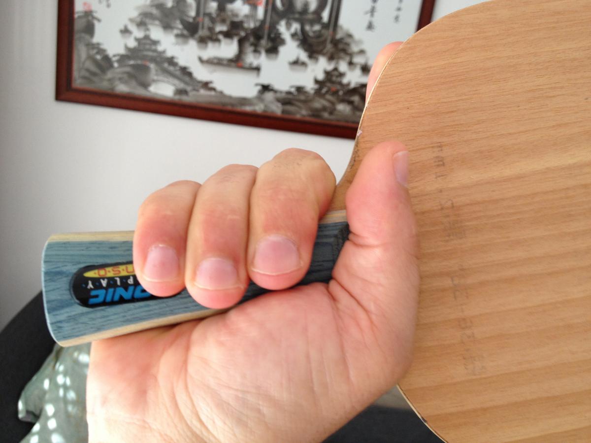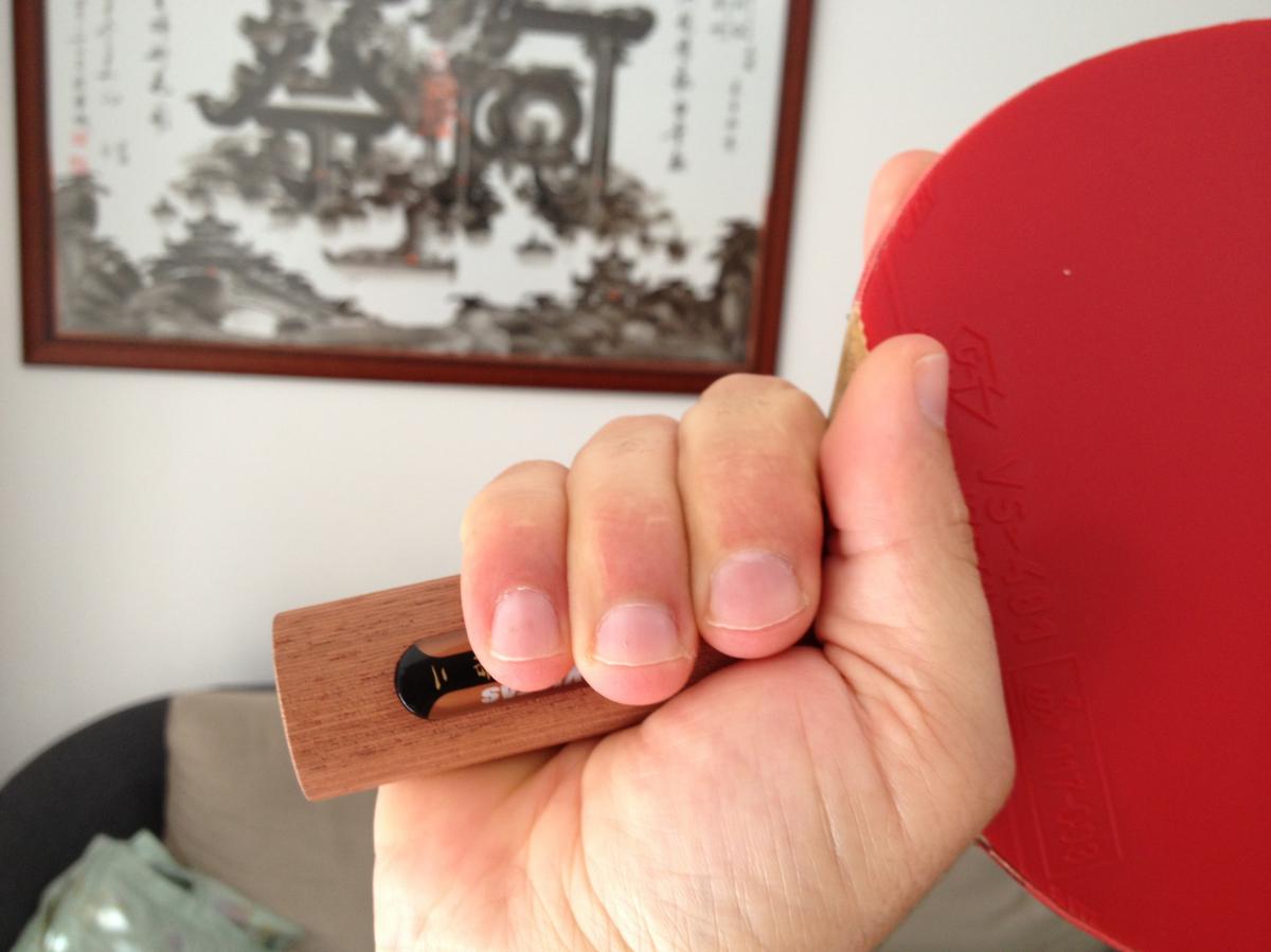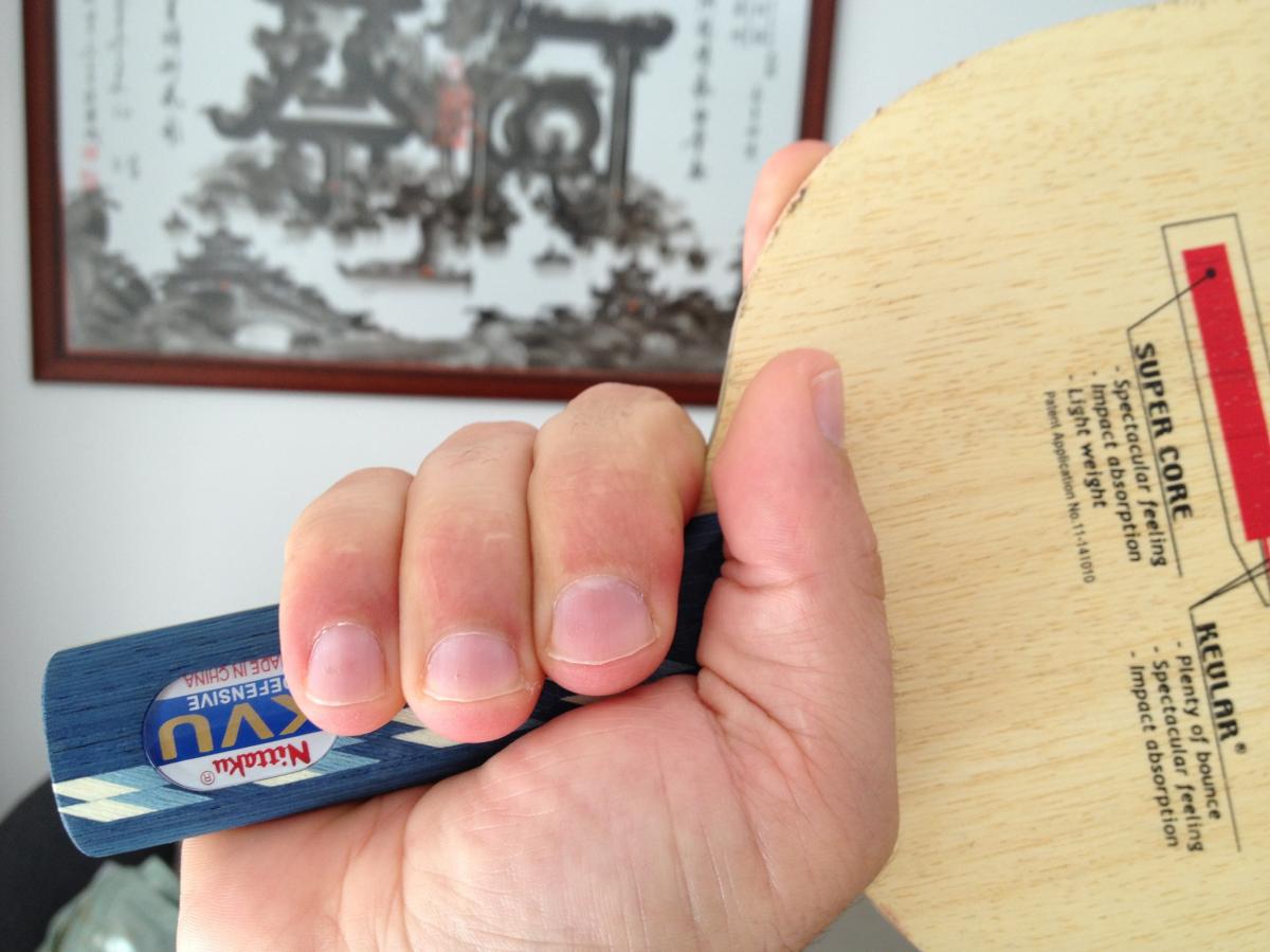 Größtes Problem ist das deutlich höhere Gewicht (160g statt bisher 144g, trotz nur 1,8 mm Schwamm beim VS>401). Beim Griff unterscheidet sich das VKM kaum vom Schild bzw. Horsa. Der Griff ist nur ca. 0,5 cm kürzer, das macht bei meinen normalgroßen Händen keinen Unterschied. Die Flügel sind praktisch genauso wie beim Schild, das Holz liegt mir also eigentlich gut in der Hand.