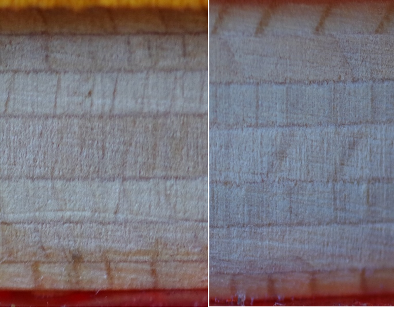 Kurzum, die sehen völlig gleich aus (daher auch kein Bild) und unterscheiden sich nur in der Dicke (7p-2a.7t 0,5mm dicker). Ein Vergleich der Querschnitte zeigt, dass das Kernfurnier beim 7p-2a.7t etwas dünner ist, die beiden direkt unter den Außenfurnieren liegenden Zwischenfurniere aber deutlich stärker.