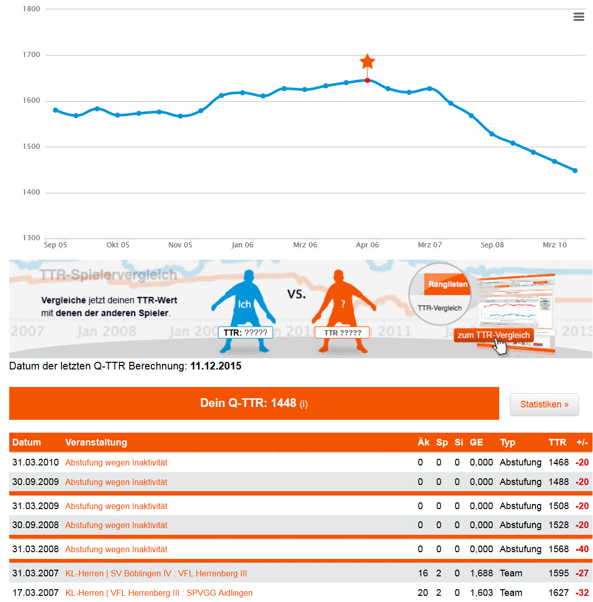 Da hat mich der bayerische Verband ja ganz schön gefickt. Anstatt meine Bewertung aus meiner Berliner Zeit zu übernehmen, wird stattdessen mein Q-TTR von 2010 nach Jahren der Inkativität in Ba-Wü (click-TT Verband) übernommen. Heißt in Zahlen nun 1448 statt 1750. Na schönen Dank auch, wird wohl Jahrhunderte dauern bis ich wieder auf dem alten Wert bin, besonders weil ich aktuell nicht besonders viel Zeit für TT habe.