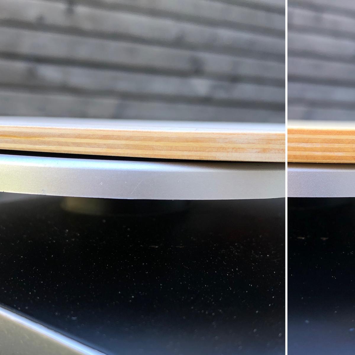 Am zweiten Lehrgangstag bin ich mit KN auf der RH aufgetaucht. Das eine Holz war das "Geschändete" und das andere das VKMS...jeweils spektokulär belegt. Auf dem Letzterem klebte ein mediumharter H8 und auf dem anderen ein H3 ( vermutlich neo ). Das VKMS Setup war etwas langsamer und das andere war neben der höheren Geschwindigkeit auch etwas steifer. Beide Kombis ließen sich gut spielen. Mit dem abgespeckten Novem bin ich dann auch zum Balleimer geschlürft. Herr Gardos Sr. hatte es sich ganz neugierig angesehen.