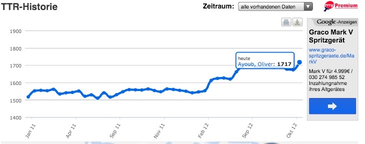 Daher plaediere ich dafuer, dass die hiesigen Nutzer das TTR-Feld mit sinnvollen Werten belegen, oder zumindest eine ordentliche Schaetzung abgeben. Eine ordentliche Schaetzung bedeutet, dass jemand, der sich z.B. auf mittlere Kreis- oder Bezirksebene verordnen wuerde, auf einen Wert zwischen 1400 und 1700 kommt, selbst wenn er z.B. in der Schweiz beheimatet ist. Nicht ordentlich waere dementsprechend ein stetes Wechseln der TTR-Werte zwischen 666 und 1961. ;)