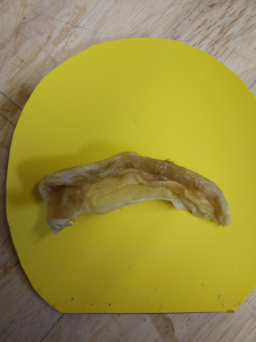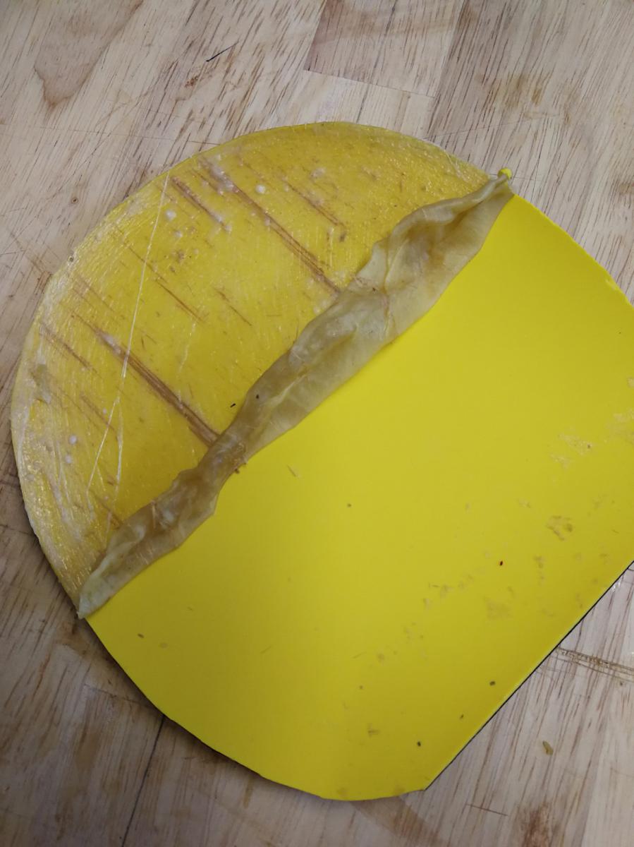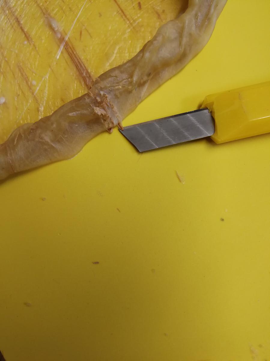 Das hatte geklappt. Ich konnte sofort anfangen, die Latexpelle vom Griffansatz her nach oben abzuziehen. Zum Teil durchbohrten dabei die Fasern die Latexschicht, aber dem konnte durch Anheben des Faserendes mittels Cutter abgeholfen werden.