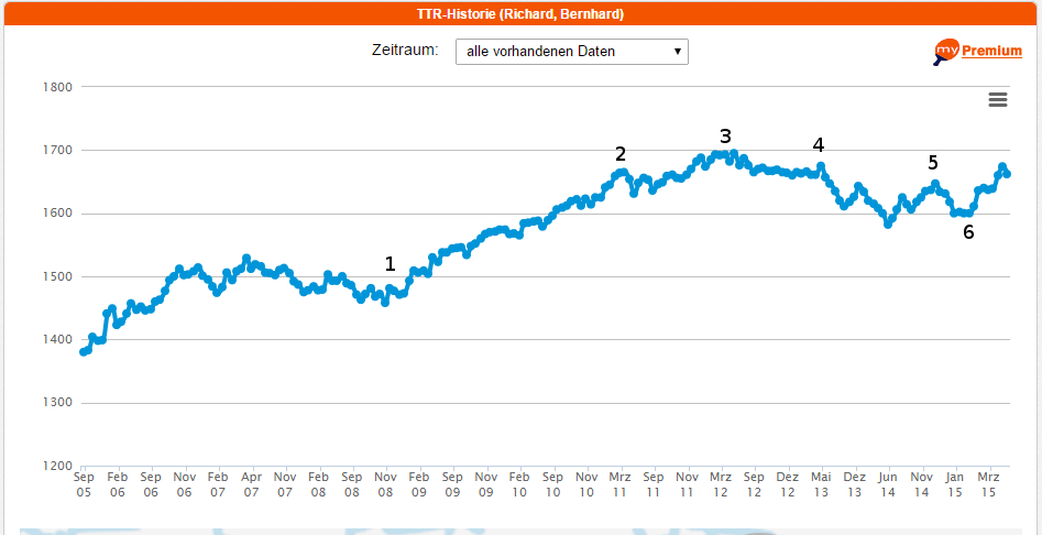 Nur kleiner Verlust nach GLN-Verbot, da eher lange Abwehr spielend. Größerer Verlust nach Insider Verbot (die beste Störnoppe für meine Spiel!). Absturz nach schwerer Krankheit in der Familie und darauf folgendem Trainingsmangel (i.d.R. nur noch ein Mal TT pro Woche, egal ob Punktspiel oder Training).