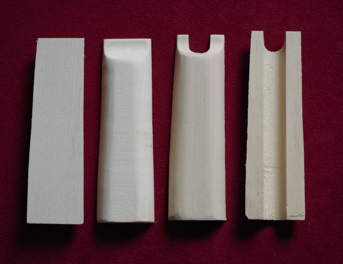 Auf dem Bild links ist ein Paar konischer Schalen abgebildet. Mit Japanischer Zeder wiegen sie 17g; diese Exemplare aus Linde aber 28 g ! Da ich momentan ohnehin im Bereich 85-90 g mit meinen Hölzer liege, ist das nicht akzeptabel => Endgewicht dann 96-101 g.