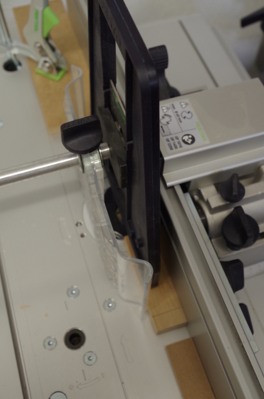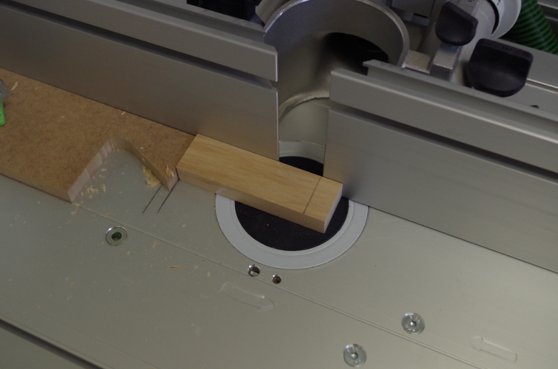 - der Abstand der Anschlagschiene zum Fräskopf muss so eingestellt sein, dass der Fräskopf genau mittig im Rechteck schneidet. Das hat mich 6 Versuche gekostet ! Jetzt habe ich Filzstiftmarkierungen auf dem Tisch angebracht, habe aber dennoch meine Zweifel, ob das beim erneuten Aufbau auf Anhieb klappt.