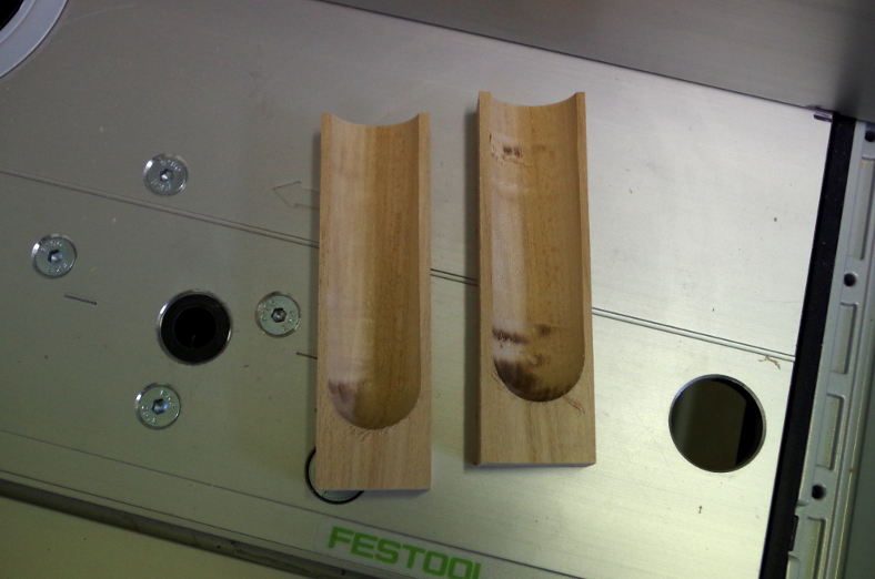 Die Griffe gefräst und aufgesetzt: irgendwas ist krumm. Entweder sitzen sie unten, dann ist oben ein Spalt oder umgekehrt. Nolens volens :motz: unten gepresst und oben bei der Abflachung in Kauf genommen, dass dieses Stück 1mm absteht :banghead: .