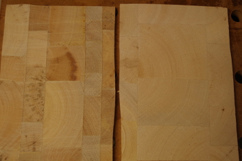 A propos Kiri-Kern. Anfangs hatte ich eine 18mm starke Tischplatte (120x60cm) aus Kiri in drei 120x20cm Streifen geschnitten und mir die Bretter dann von einem Bekannten mit der Kreissäge spleissen lassen in je zwei Bretter zu ca. 9mm. Die wurden dann in 27 cm Abschnitte zersägt, welche ich mit dem Breitbandschleifer auf die gewünschte Dicke abgetragen hatte.