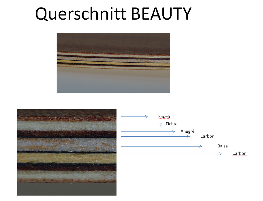Also wie das 147 nur mit 1 mm Balsa statt 0, 6 mm WRC als Zwischenfurnier und einer zusätzlichen Lage unidirektionalen Carbongeleges (quer) unter dem CCRo Außenfurnier. Die Idee hinter Balsa statt WRC: stärkeres Einbremsen. Das zusätzliche UDC soll das Balsa zähmen (=> weg mit dem Katapult, der aber bei 1 mm ohnehin kaum spürbar ist), die Härte außen erhöhen und so vielleicht den Ballabsprung wieder flacher gestalten.