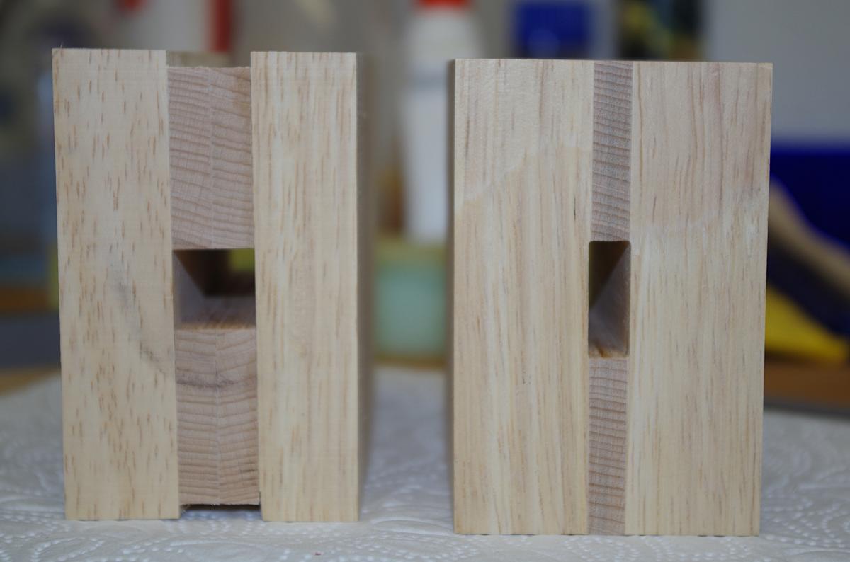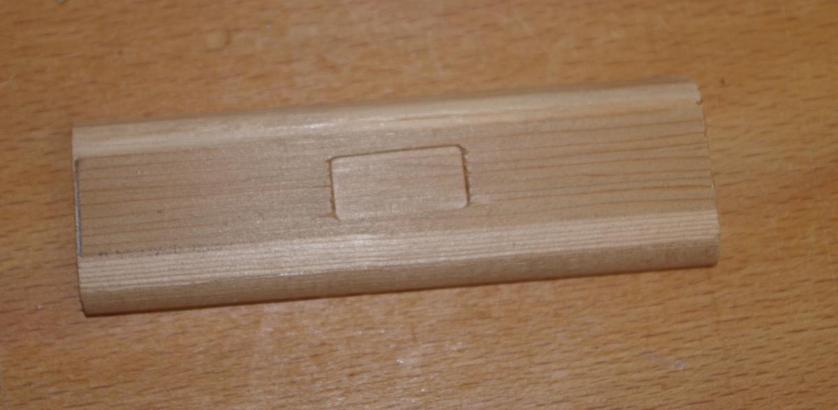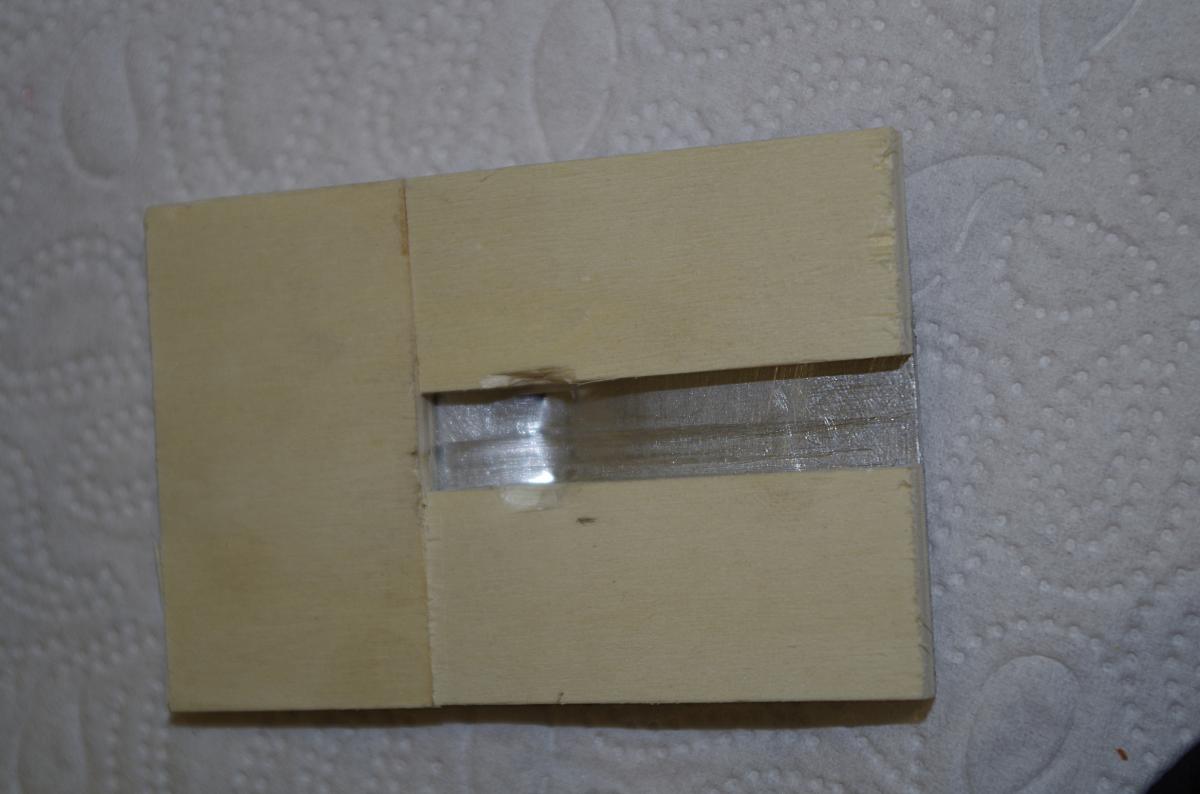 Ich montiere auf meine Fräse eine auf 10 mm Länge verkürzte Schleifhülse. Durch den Tisch habe ich eine Auflage, so dass ich das fertige Holz - auweia, welch' Risiko - vorsichtig mit dem Griff an der Hülse vorbei führe und einen ca. 1 mm (wie kriege ich das bloß halbwegs genau hin :dontknow: ) tiefen und 20 mm langen "Graben" erschleife. Dessen Wand läuft zwar nicht im rechten Winkel senkrecht nach oben sondern als Halbrund, aber das könnte ich mit einem Stechbeitel hinkriegen.