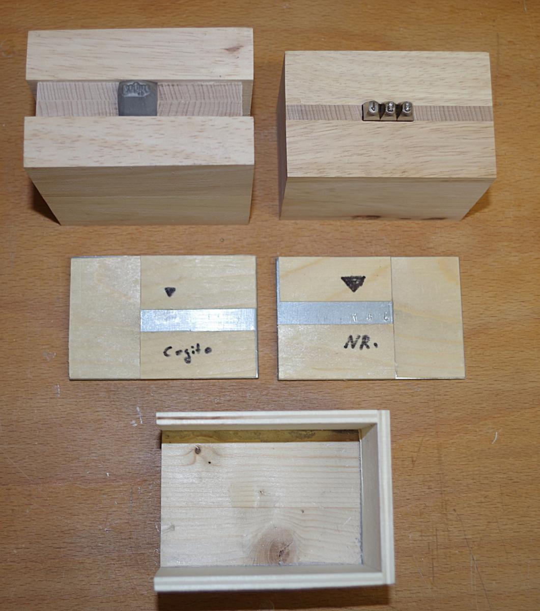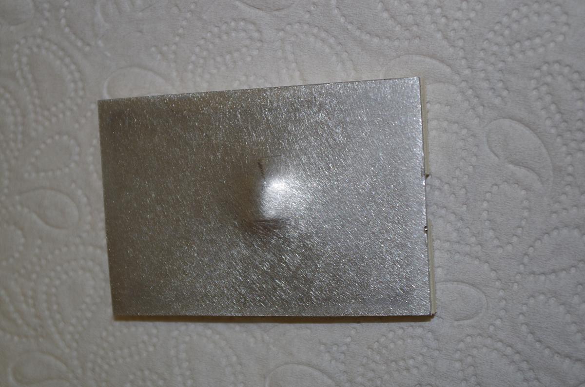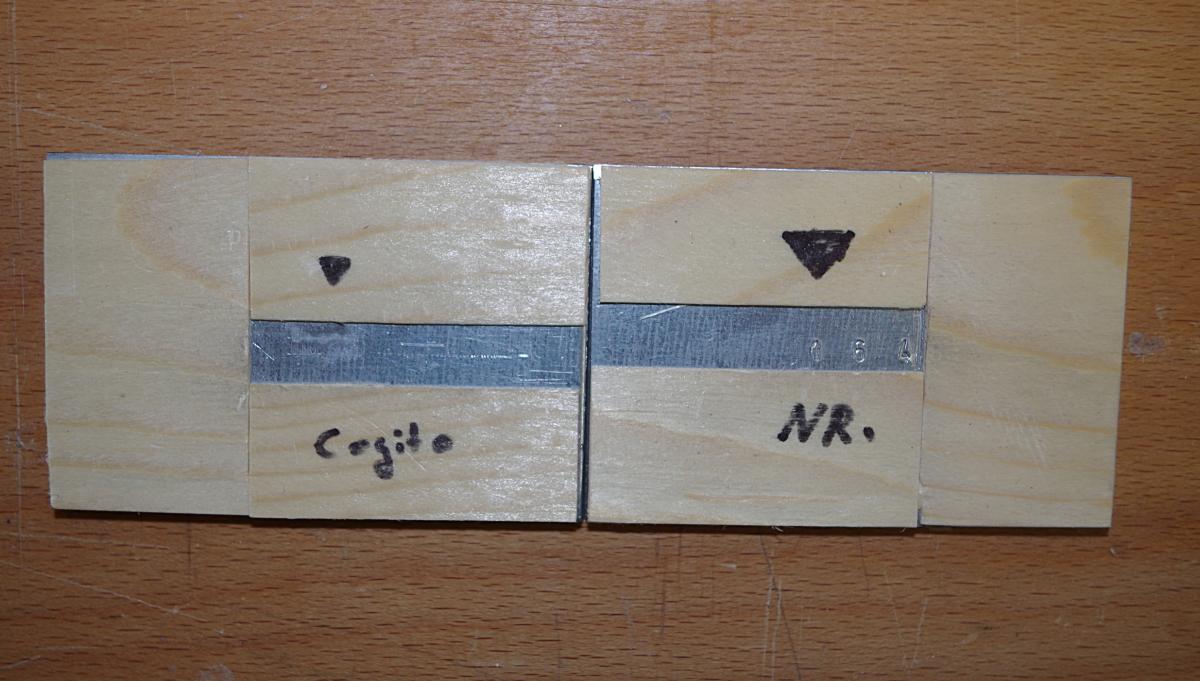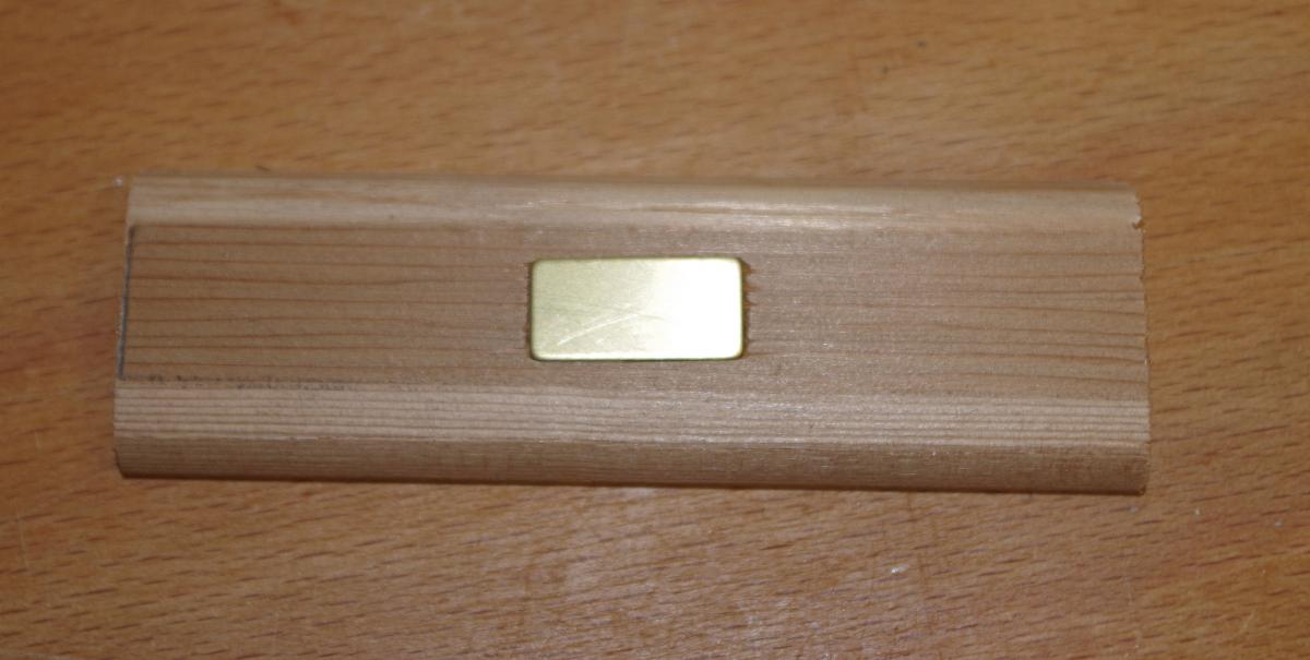 Der nächste Anlauf daher mit 5 mm Edelstahl und 0,9 mm Fichtenfurnier als Rahmenmaterial; das Messingplättchen ist 1mm dick. Hier die endgültigen Werkstücke