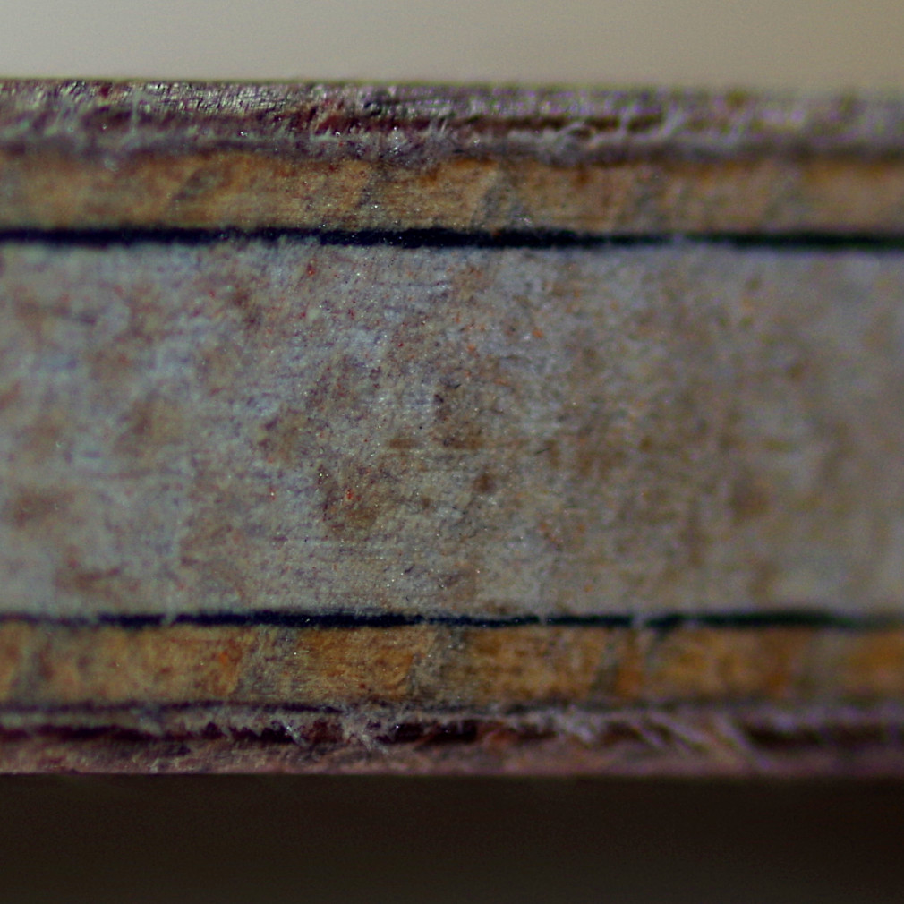 Doch da schlug das Schicksal in Gestalt von Michael Schneider zu. Der fiese Möpp schickte mir doch zwei Laminate, die mit einem gänzlich neuen - und von mir leider aufgrund fehlender Apparaturen nicht nachvollziehbarem - Klebeverfahren hergestellt waren. Ich solle mal sehen, ob das was taugt. Also gleich mal zwei Großblätter geschnitzt.